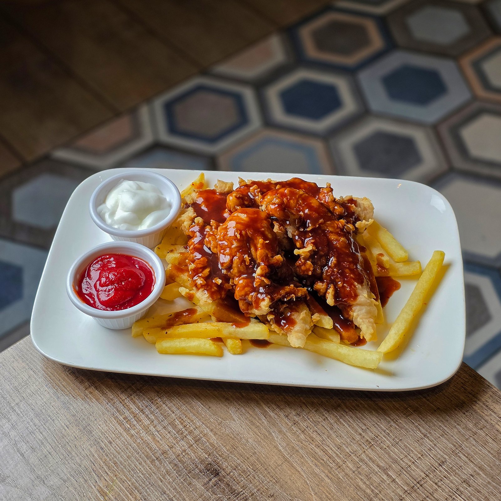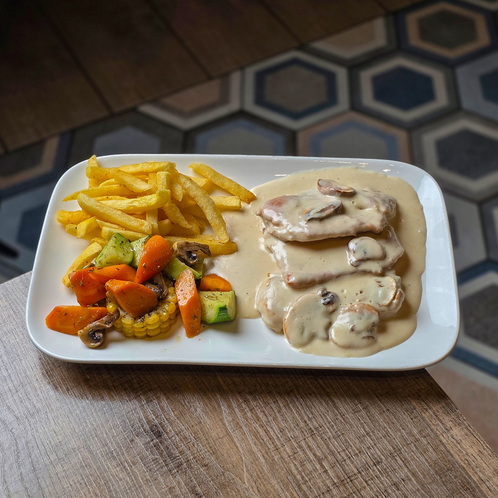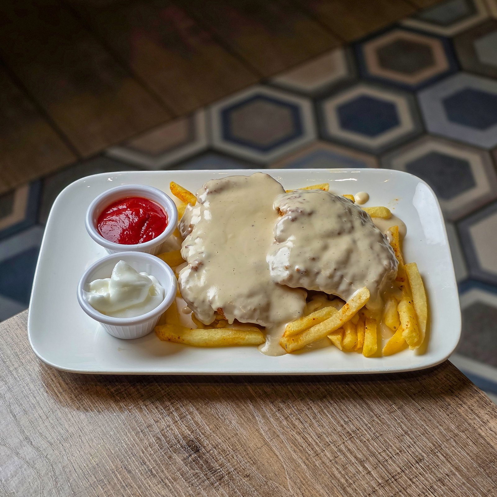With your choice of sauces Cream of mushroom, Poivre, Cheese